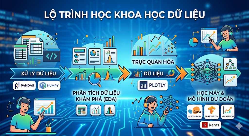 Bên cạnh đó, khóa học còn giúp học sinh hiểu cách hoạt động của các thuật toán học máy như Regression, Classification, Clustering và Deep Learning. Học viên sẽ được thực hành huấn luyện mô hình, đánh giá kết quả và tối ưu hiệu suất của mô hình bằng các phương pháp như cross-validation, hyperparameter tuning và pipeline trong Machine Learning.