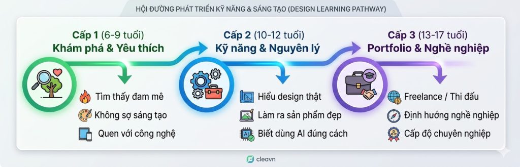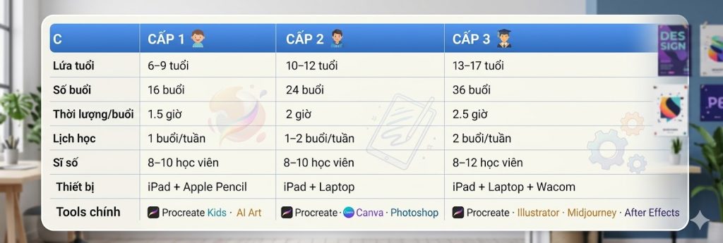 Triết lý: Lứa tuổi bắt đầu có ý thức thẩm mỹ và muốn tác phẩm trông “thật” và “đẹp.” Chương trình giúp các em hiểu nguyên lý thiết kế thực sự — không chỉ biết dùng tool.
