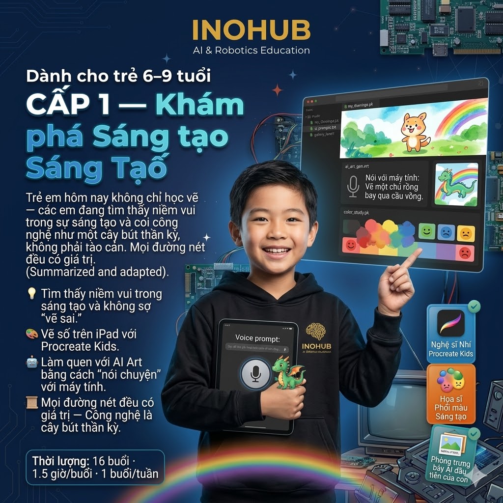 Triết lý: Ở lứa tuổi này, mục tiêu không phải là kỹ thuật — mà là giúp con tìm thấy niềm vui trong sáng tạo và không sợ “vẽ sai.” Mọi đường nét đều có giá trị. Công nghệ là cây bút thần kỳ — không phải rào cản.