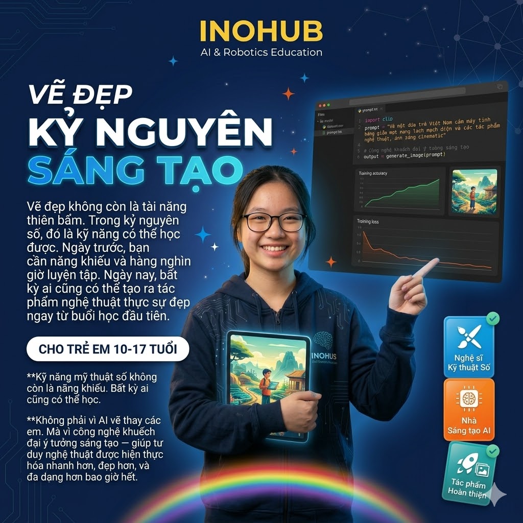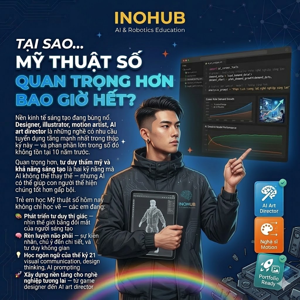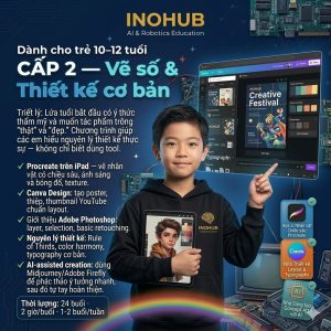 🎯 STEM mindset trong từng bài học sáng tạo: INOHUB tích hợp tư duy logic và sáng tạo — học viên không chỉ học “vẽ đẹp” mà còn học cách giải quyết vấn đề thị giác: tại sao layout này hoạt động, tại sao màu này tạo cảm xúc đó, tại sao font này truyền đạt thông điệp này.