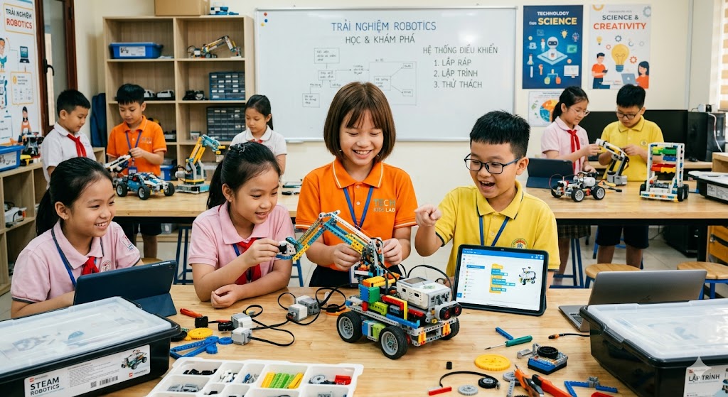 Học sinh sẽ tham gia vào các hoạt động lắp ráp, lập trình và thử thách robotics thông qua nhiều mô hình robot thú vị. Các chủ đề học tập được thiết kế gần gũi với cuộc sống, giúp các em vừa học vừa khám phá thế giới công nghệ xung quanh.