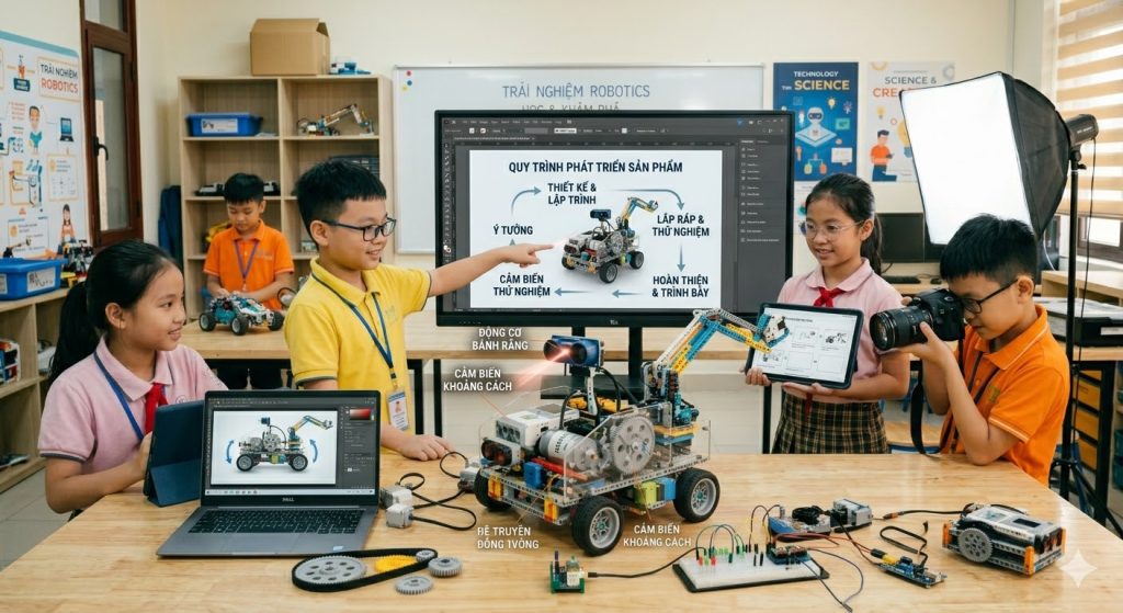 Sau khi hoàn thành các mô hình robot, học sinh sẽ trình bày và chia sẻ sản phẩm của mình thông qua hình ảnh và các hiệu ứng trên phần mềm thiết kế. Điều này giúp các em hiểu được quy trình phát triển một sản phẩm công nghệ từ ý tưởng đến hoàn thiện.